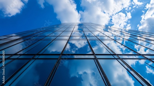 Modern skyscraper facade reflecting a vibrant blue sky and fluffy white clouds, showcasing a striking geometric pattern of glass and steel. : Generative AI
