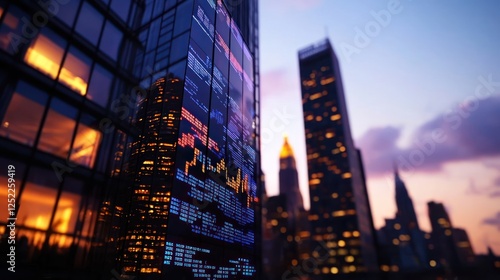 Modern skyscraper reflecting sunset with digital display and city skyline in background
