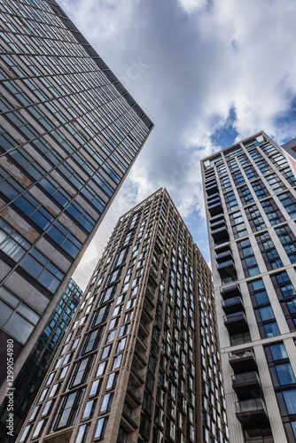 business district, tall building, urban development, real estate, construction, city centre, business center, structural engineering, modern architecture, skyscraper, cloudy sky, city landscape, building, architecture, urban, building, perspective, upward, exterior, outdoors