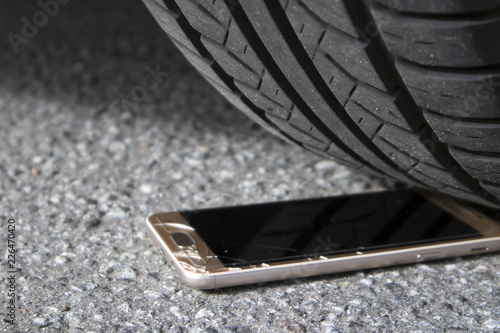 Modern smart phone with cracked screen glass on the asphalt under the car wheel