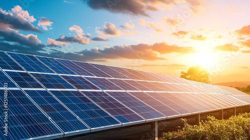 Modern solar farm with aligned panels reflecting sunlight at sunset