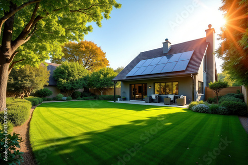 Modern Solar Homes in Spring and Summer Landscapes ,Eco-Friendly Living and Renewable Energy Concepts.