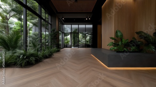 lobby, interior, modern, design, contemporary, luxury, reception, apartment, condo, hotel, residential, commercial, minimalist, plant, greenery, natural, wood, floor, parquet, decor, elegant, stylish, space, open, view, garden, green, foliage, tropical, fresh, calm, zen, office, reception desk, entrance, warm, natural light, light, fresh air, high-end