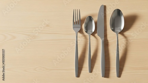 cutlery, silverware, utensil, stainless steel, modern, dining, eating, fork, knife, spoon, tablespoon, teaspoon, metal, kitchen, table, wood, wooden, background, beige, light, clean, simple, minimalist, concept, food, gastronomy, eatery, breakfast, lunch, dinner, place setting, tableware, elegant, polished, overhead, topview, empty space, copy space, hospitality, service, setting, silver, object, still life