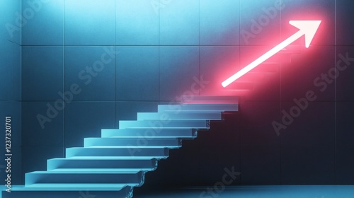 Modern Stairs with Neon Arrow Indicating Growth and Progression