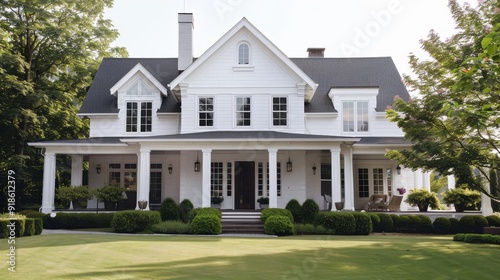 Modern Suburban Dream Home Stylish White House with Gabled Roof Front Porch and Lush Landscaping Ideal for Peaceful Living