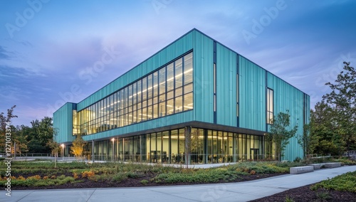building, architecture, modern, teal, glasses, window, landscape, design, exterior, contemporary, structure, facades, evening, dusk, sky, cloud, green, metal, wall, light, illumination, pathway, landscaping, plant, tree, ground, property, commercial, office, campus, college, university, school, education, facility, real estate, development, urban, city, scene, image, photo, picture, view, perspective, outdoors, daytime, night, sunlight