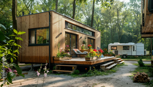 Modern tiny house with wooden exterior in a lush forest setting, featuring a cozy deck and vibrant flower arrangements, perfect for nature retreats.
