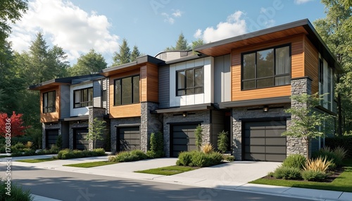 Modern townhomes with large windows surround lush garden areas. Buildings feature wood, stone, grey paneling. This architectural design showcases contemporary residential living spaces, properties.