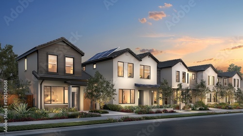 house, row house, home, architecture, modern, contemporary, residential, real estate, property, sunset, dusk, evening, sky, cloud, street, road, landscape, exterior, facades, design, building, home, dwelling, solar, panel, energy, efficient, sustainable, community, neighbourhood, development, urban, suburban, light, window, door, siding, roof, landscaping, plant, tree, illumination, twilight, calm, peaceful, serene, new, construction, style
