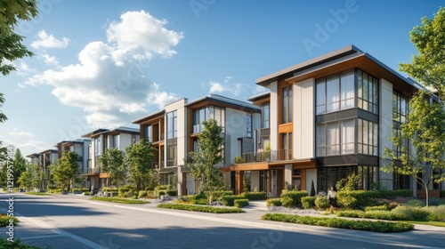 Modern townhouses, sunny street, green landscaping, suburban life, real estate