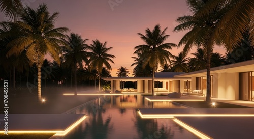 villa, house, home, resort, hotel, building, architecture, modern, contemporary, minimalist, luxury, exterior, property, estate, residence, design, tropical, palm, tree, sky, sunset, dusk, twilight, evening, night, water, nature, landscape, exotic, island, paradise, pool, swimming, light, lighting, illuminated, glowing, warm, ambient, led, expensive, exclusive, elegant, serene, tranquil, calm, peaceful