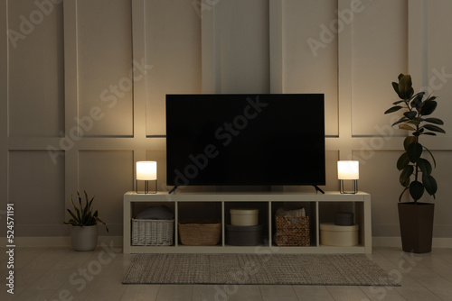 Modern TV on cabinet, lamps and beautiful houseplants near white wall in room. Interior design