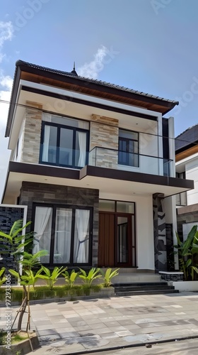 house, home, modern, architecture, exterior, balcony, stone, 2, storey, building, residential, real, estate, property, design, style, front, door, window, glasses, roof, garden, lawn, yard, sky, blue, white, brown, grey
