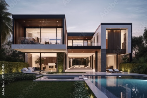 house, modern, contemporary, architecture, home, luxury, villa, residence, building, design, 2, story, story, dusk, evening, night, pool, forever, swimming, water, landscaping, garden, tree, plant, shrub, greenery, exterior, facades, minimalist, sleek, elegant, roomy, glasses, window, balcony, deck, patio, lighting, illumination, concrete, wood, stone, relaxation, tranquil