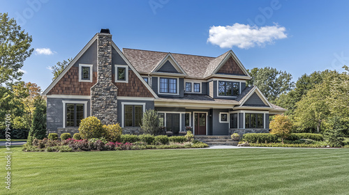 Modern two-story family home with manicured lawn, contemporary architecture, large windows, and stone chimney in a tranquil residential neighborhood.