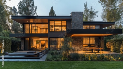 modern, two-story, glasses, house, garden, architecture, dusk, exterior, luxury, design, residential, contemporary, landscape, facades, window, tree, lighting, greenery, home, stylish, view, sunset, sky, elegant, structure, building, patio, roomy, backyard, nature, hedge, stone, warm, night, relaxing, cosy, lawn, foliage, silhouette, tranquil, scenic, comfort, urban, evening, peaceful, estate