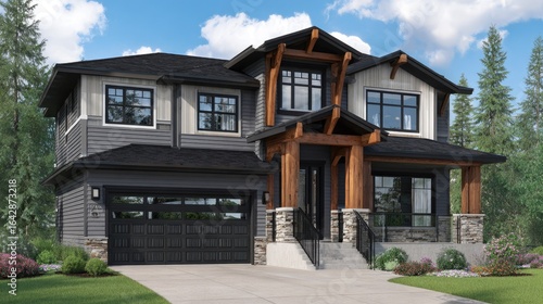 house, home, door, window, colonial, wooden, facades, design, garage, render, architecture, property, dwelling, wood, yard, structure, real, beam, building, stone, residential, porch, grass, contemporary, modern, craftsman, grey, black, front, tree, exterior, estate, view