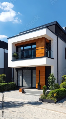 Modern two-story house with white walls, wooden accents, and balcony. Sunlit exterior features sleek design, landscaping, and paved driveway.