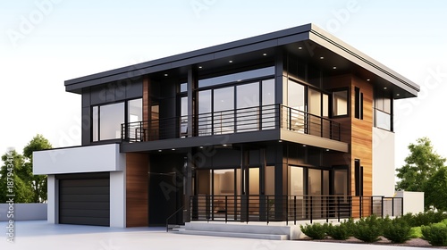 Modern two-story house with wood and glass exterior and black balcony railings
