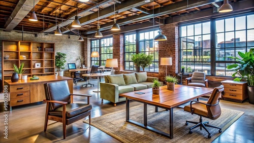 Modern, upscale consignment office filled with gently-used, high-quality furniture pieces, including desks, chairs, and