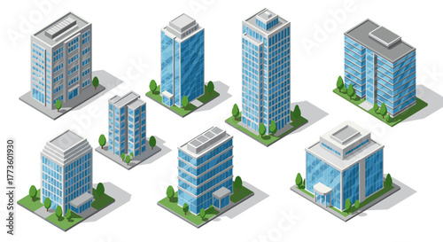 Modern urban buildings isometric design with green spaces
