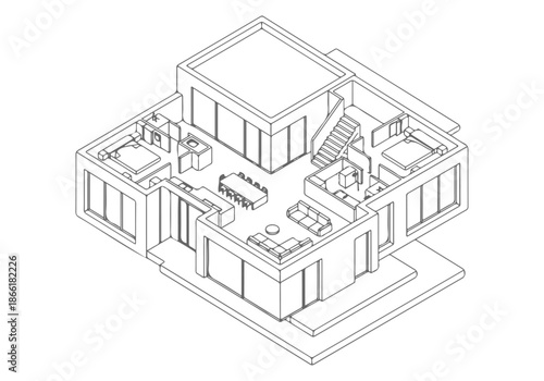 cad, architecture, technical drawing, line art, vector, modern, villa, isometric, blueprint, living, space, large, window, flat, roof, architectural, drafting