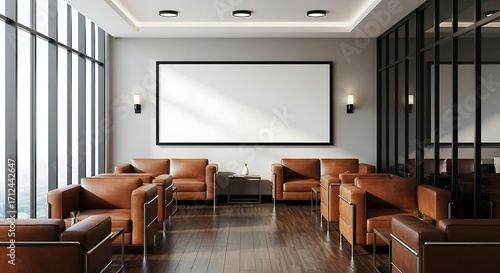 Modern waiting room features brown leather chairs and a blank screen for presentations in a stylish office space, creating a professional and inviting atmosphere.