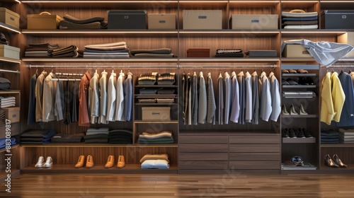 Modern Walk-in Closet with Wooden Shelving and LED Lights.
