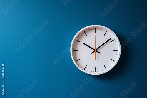 Modern wall clock displaying time against a blue background in a minimalist setting