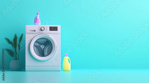 Modern Washing Machine with Detergent Bottles and Minimalist Blue Background