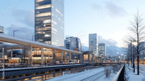 Modern Waterfront Cityscape Snow Winter Urban Architecture Skyscrapers Canal Bridge