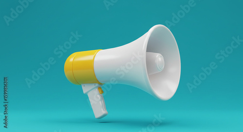 Modern White and Yellow Megaphone on Teal Background: 3D Render of Announcement Device.