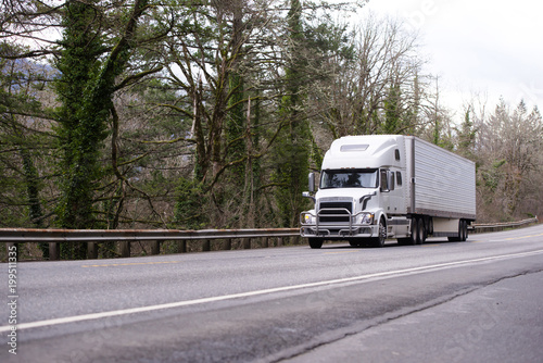 Modern white big rig semi truck transporting reefer semi trailer with commercial cargo on the road with forest