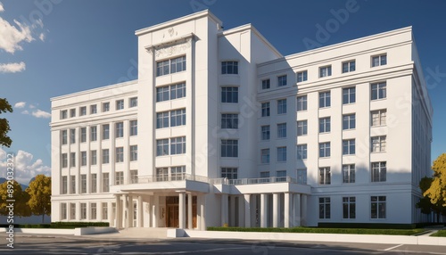 white building, modern architecture, building exterior, pillar, column, window, door, entrance, doorway, facades, business building, business building, government building, municipal building, urban building, building design, city landscape, city architecture, sunny day, blue skies, cloud, street, sidewalk, landscape, city landscape, design, modern, classic, white, grey, green, blue, empty, no people, real estate, property, development, construction