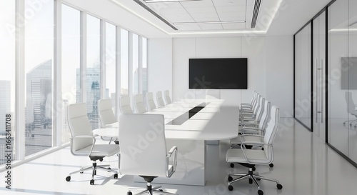 office, conference, room, meeting, modern, white, chair, table, desk, corporate, business, city, skyscraper, view, window, glasses, interior, design, architecture, contemporary, professional, workspace, elegant, minimal, clean, bright, sunlight, daylight, screen, television, technology, wall, floor, panel, partition, space, building, urban, executive, style, setting