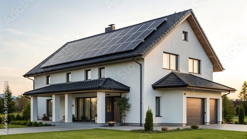 Modern white house with a dark roof covered in numerous solar panels, symbolizing renewable energy and sustainable living in residential architecture.