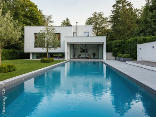 architecture, exterior, home, house, modern, pool, swimming, lawn, garden, tree, white, design, property, residence, building, real, estate, luxury, style, contemporary, outdoors, day, residential, landscape, grass, yard, structure, facades, minimalist, geometric, clean, minimal, sunny, daylight, water, clear, blue, summer, lifestyle, recreation, tranquil, relaxation, leisure, vacation, holiday, destination, travel, tour tourism