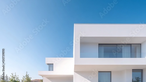 Modern white house with large windows against a clear blue sky.