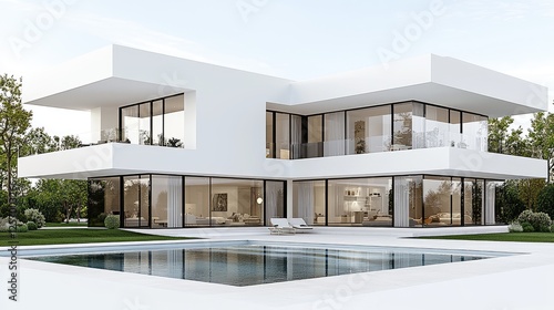 Modern White House with Pool, Sunny Day, Exterior View, Photorealistic