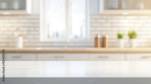 Modern white kitchen with an empty countertop in focus and a blurred background, providing space for product placement and advertising
