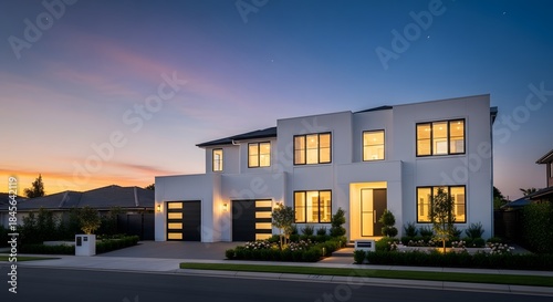 house, home, modern, exterior, white, luxury, architecture, residential, building, garage, design, style, property, real, estate, family, investment, new, construction, facades, window, garden, suburb, neighbourhood, driveway, contemporary, expensive, residence, view, structure, lawn, light, evening, sky, twilight