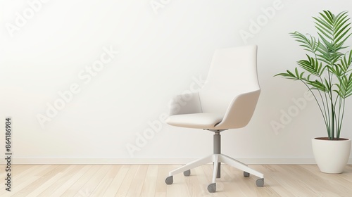 Modern white office chair on a wooden floor with a potted plant against a minimalistic white background. Perfect for home office setup inspiration.