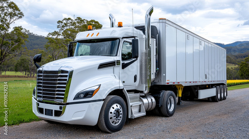 truck, white, semi-truck, rural, countryside, vehicle, transport, freight, logistic, delivery, transportation, trailer, highway, landscape, travel, commerce, road, trucking, cargo, journey, modern, industry, diesel, power, equipment, gravel, shipping, scenic, nature, sky, tree, engine, driver, business, route, mobility, machinery, drive, hauling, professional, operation, infrastructure
