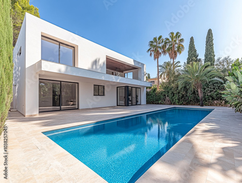Modern white villa with swimming pool surrounded by palm trees on a sunny day in a tranquil setting