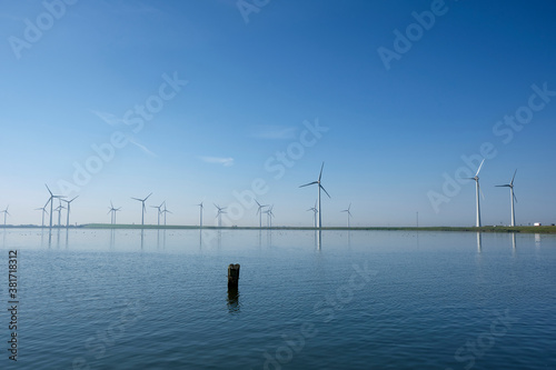 Modern windmills in the water near the shore along a green grassy dike