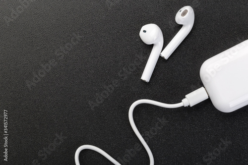 Modern wireless bluetooth headphones with charging case on a dark black background.