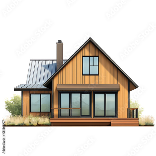 Modern wooden house design with large windows and a welcoming porch in a serene natural setting