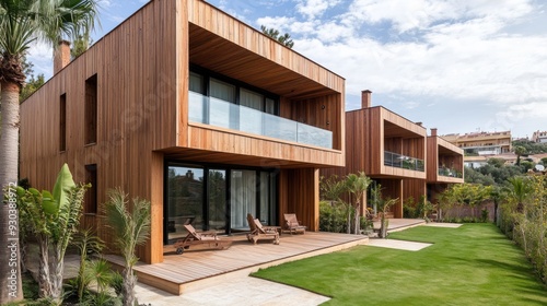 villa, modern, wooden, deck, lawn, green, grass, house, home, architecture, design, exterior, contemporary, building, residential, balcony, patio, glasses, window, door, sun, sky, cloud, palm, tree, leaf, tropical, landscape, luxury, resort, vacation, relax, lounge, chair, comfortable, stylish, elegant