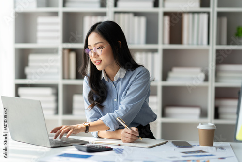 Modern working lifestyle Asian businesswoman sits at desk with laptop online using internet and notepad happily recording receipt contact information online delivery orders.